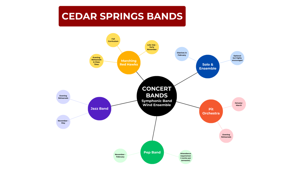 The Symphonic Band is one of two concert bands in the Cedar Springs High School band program. The Symphonic Band begins meeting in November and is made up of students from all grade levels. The Concert Band focuses on developing and refining instrument playing skills and performing quality music literature. The Symphonic Band will perform 3-4 concerts throughout the school year and during the month of March is a participant in the MSBOA Band Festival.